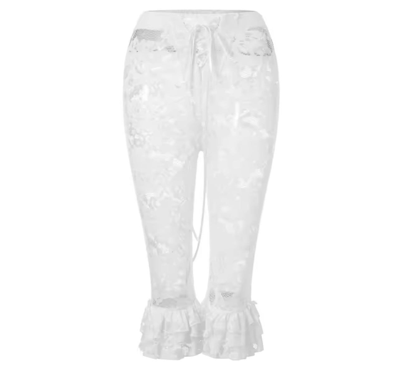 Women Floral Lace Capri Pants Coquette See-Through High Waist Ruffles Hem Trousers Summer Casual Pants Stretch Crop Legging