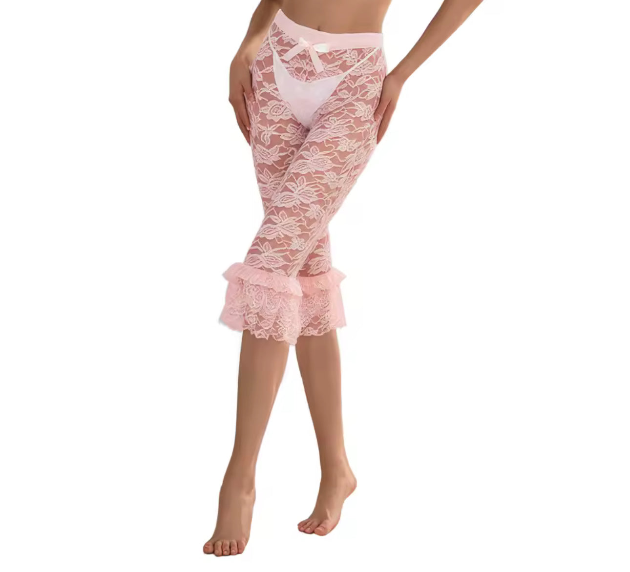Women s High Waist Lace Ruffle Capri Leggings with Sheer Mesh Detailing and Elastic Waistband fo