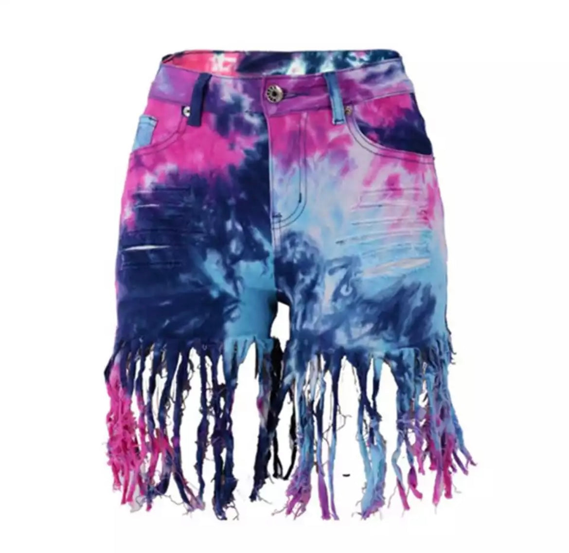 Women Tie Dye Print Tassel Mid Waist Sexy Ripped Jeans Shorts Fashion Summer Short Denim Trousers Pants